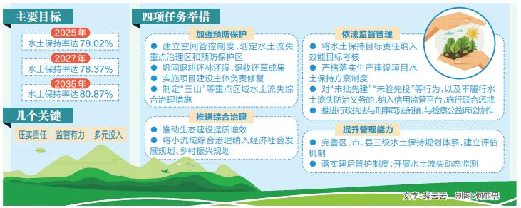 “让保护生态得到合理回报,让破坏环境付出沉重代价。”方案明确将水土保持目标责任纳入效能目标考核,对考核优秀的,予以倾斜支持;对成绩显著的单位和个人,予以表彰奖励;严格落实生产建设项目水土保持方案制度,从立项审批、项目实施、验收报备等环节,加强全链条、全过程监管,突出对能源、住建、交通运输、水利、农业等重点领域的监管。对“未批先建”“未验先投”等行为,以及不履行水土流失防治义务的,纳入信用监管平台,施行联合惩戒。